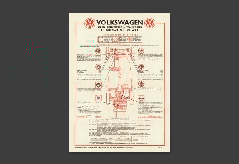 Superb quality reproduction lubrication chart for Beetle Sedan, Convertible & Karmann Ghia 1200, 1300, 1300A, 1500 & Transporter.